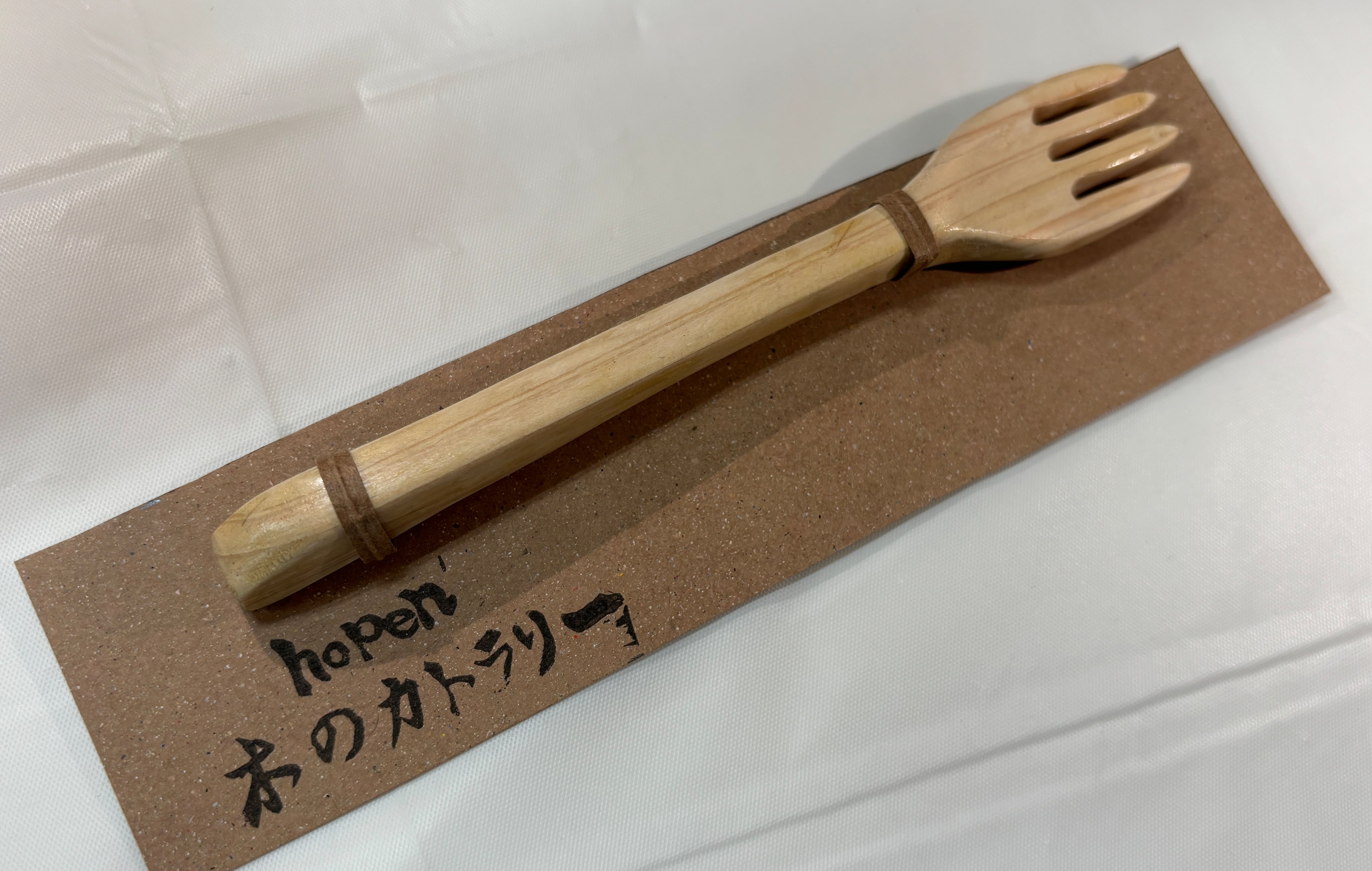 ヒノキで製作した木のフォークです。hopenで働く作家さん方が製作した世界に1本だけの商品です。