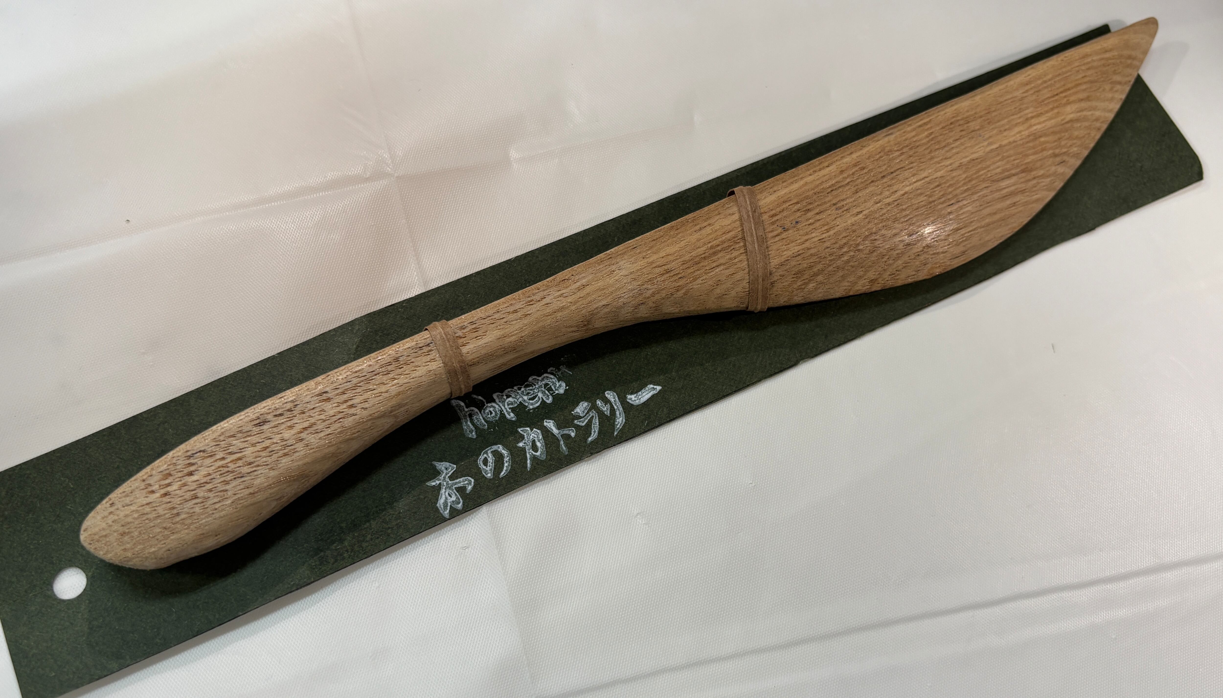 大きな木のカトラリー(ナイフ大)です。このユニークなアイテムは、まさに食卓を盛り上げる存在です。食卓に置くには少し大きすぎるこのナイフは、ジョークグッズとしても楽しめる面白さを備えています。