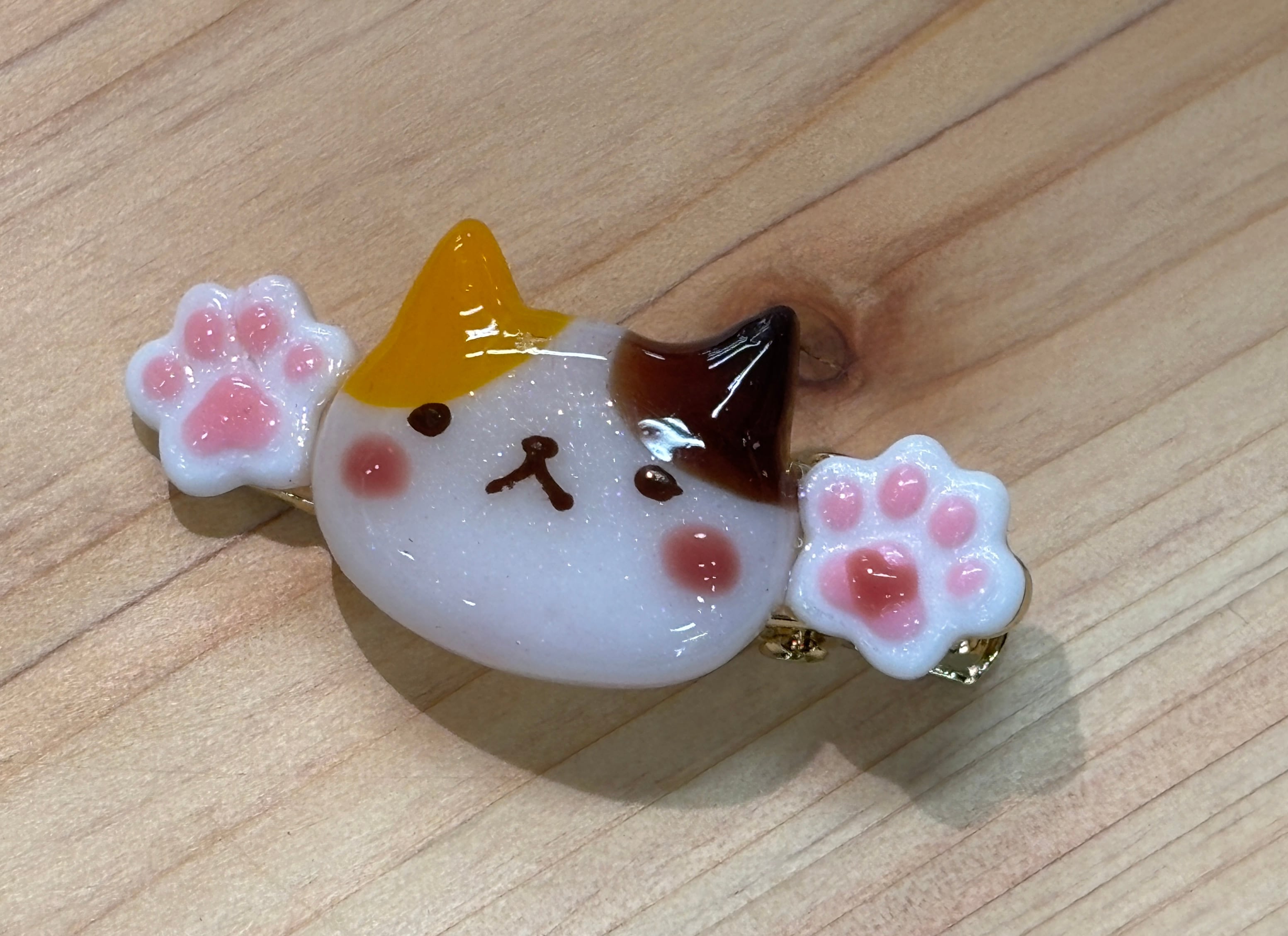 猫のバンザイヘアクリップです。この愛らしいアイテムは、三毛猫ちゃんが元気いっぱいにバンザイしている姿をモチーフにしたヘアクリップです。レジン製のため、軽量で扱いやすく、日常使いにも華やかさをプラスしてくれます。